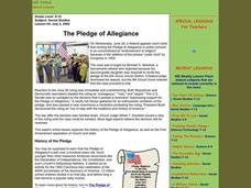 Students study the history of the Pledge of Allegiance. They investigate the First Amendment concept of separation of Church and state using Internet resources.
