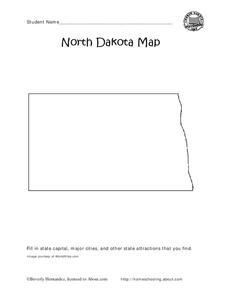 In this North Dakota worksheet, students study an outline map of North Dakota with the capital city marked. Students color the map and add other important cities and landmarks.