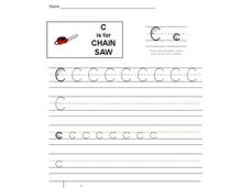 In this letter Cc worksheet, students study the stroke patterns for the uppercase and lowercase letter Cc. Kids trace and print both letters several times. Students then trace and print the word chainsaw.