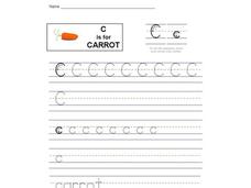In this letter Cc activity, students study the stroke patterns for the uppercase and lowercase letter Cc. Students trace and print both letters several times. Students then trace and print the word carrot.