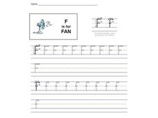 In this cursive handwriting practice instructional activity, students use the space provided to practice writing uppercase and lowercase Fs. Students also draw objects that begin with the letter and label them.