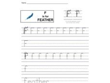 In this letter Ff learning exercise, learners study the stroke patterns for the uppercase and lowercase letter Ff. Students trace and print both letters several times. Learners then trace and print the word feather.