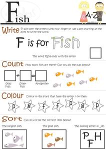 In this letter f worksheet, learners trace the word "fish," count fish and write sums, circle fish with the letter f and circle correct items in pictures.