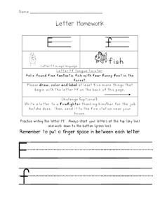 In this early childhood letter Ff worksheet, students read a tongue twister, draw 5 things that begin with the letter f, write a letter to a firefighter, and practice printing uppercase and lowercase letters.