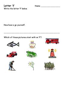 In this letter f worksheet, students trace or color the example letter f's and then write the letter f on their own. Students then circle the pictures that begin with f.