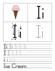 In this alphabet letter I worksheet, students trace the uppercase and lowercase alphabet letter I 13 times and then write each one 10 times on the lines provided. Students write the word ice cream once.