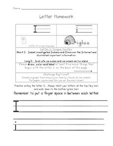 In this early childhood letter Ii activity, students read a tongue twister, draw 5 things that begin with the letter i, create a graph that shows their favorite ice cream, and practice printing uppercase and lowercase letters.