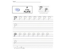 In this printing Pp practice worksheet, students view the animation showing the correct way to form upper case P and lower case p, trace, and print the letters and word plate. Students print thirty-three letters.