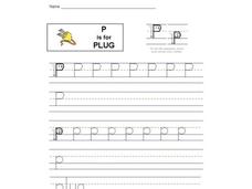 In this letter Pp worksheet, students study the stroke patterns for the capital and lowercase letter Pp. Students trace and print both letters several times. Students then trace and print the word plug.