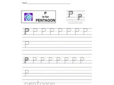 In this letter Pp worksheet, learners study the stroke patterns for the capital and lowercase letter Pp. Students trace and print both letters several times. Learners then trace and print the word pin.