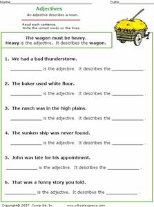 In this adjectives worksheet, students examine 6 sentences and record the adjectives in each sentence as well as the nouns they modify.