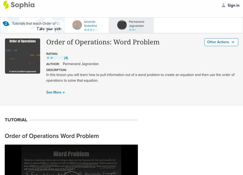 In this lesson you will learn how to pull information out of a word problem to create an equation and then use the order of operations to solve that equation. Students watch a video tutorial.