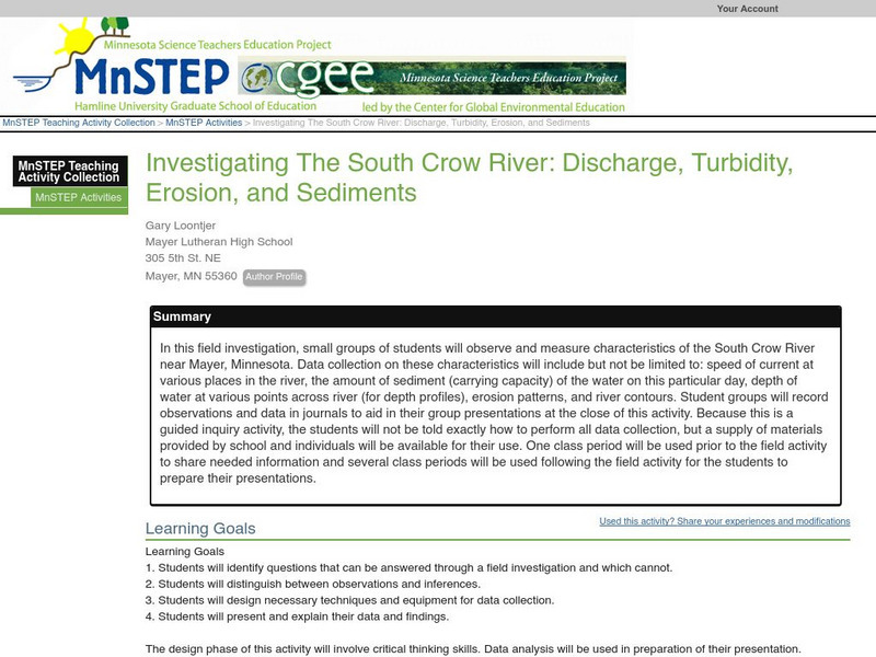 In this field investigation, small groups of students will observe and measure characteristics of the South Crow River near Mayer, Minnesota. Data collection on these characteristics will include but not be limited to: speed of current...