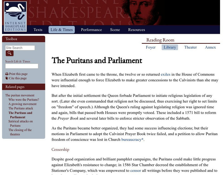 This resource provides a brief description of the political battles waged in the English Parliament between the monarchy and the Puritans. Discussion begins with the reign of Elizabeth I and continues through to that of Charles I.