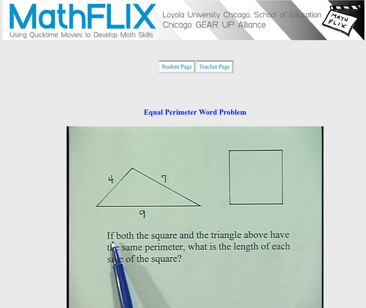 This QuickTime movie introduces the basics of perimeter and an example of how to solve equal perimeter word problems. As you watch and listen to the teacher and student interact it helps clarify the thinking behind applying this concept.