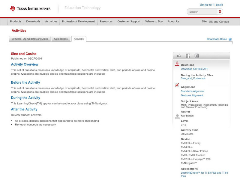 This set of questions measures knowledge of amplitude, horizontal and vertical shift, and periods of sine and cosine graphs. Questions are multiple-choice and true/false; solutions are included.