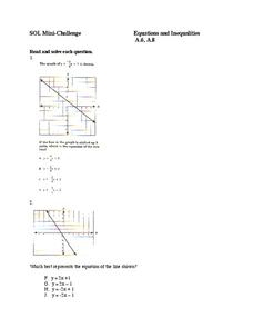 In this intercepts worksheet, 9th graders solve 10 different problems that include determining the intercepts of each equation. First, they set y equal to zero and solve for x. Then, they set x equal to zero and solve for y. They also...