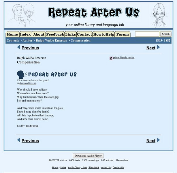 [To hear audio, use Chrome browser.] This site offers the text and audio of the poem "Compensation" by Ralph Waldo Emerson.