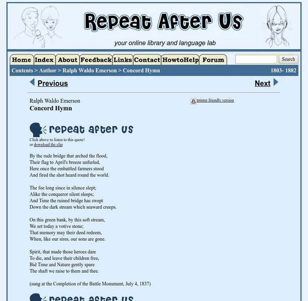 [To hear audio, use Chrome browser.] This site offers the text and audio of the poem "Concord Hymn" by Ralph Waldo Emerson