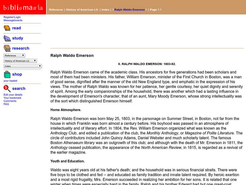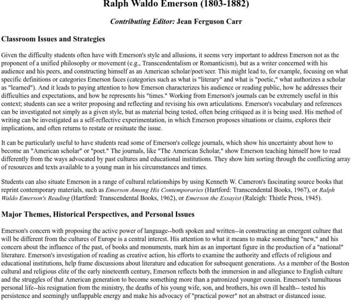 Houghton Mifflin site has an entry that discusses major themes, historical issues, writing style, audience, and literary criticism for Ralph Waldo Emerson (1803-1882). Contains discussion/study questions and a bibliography.