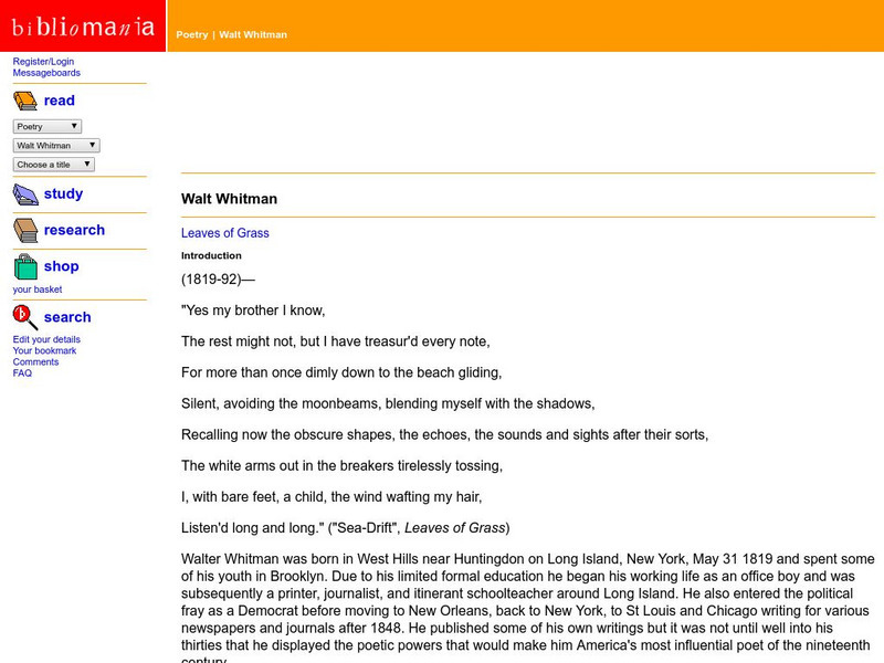 Biographical note on Walt Whitman that discusses his verse form, his life, and the influence of his poetry. Includes link to Leaves of Grass.