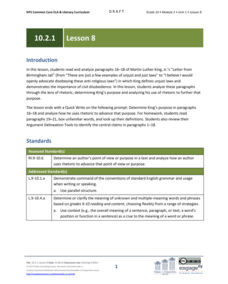 Readers analyze paragraphs from the "Letter From Birmingham Jail" and determine King's purpose and how he supports it. Scholars discuss given questions with their peers, learn new vocabulary words, and complete a quick writing prompt.