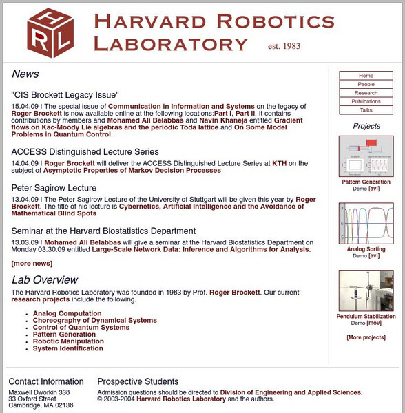 Research projects on computational vision, neural networks, tactile sensing, motion control and VLSI systems. Plus general info, Harvard and robotics related pages.