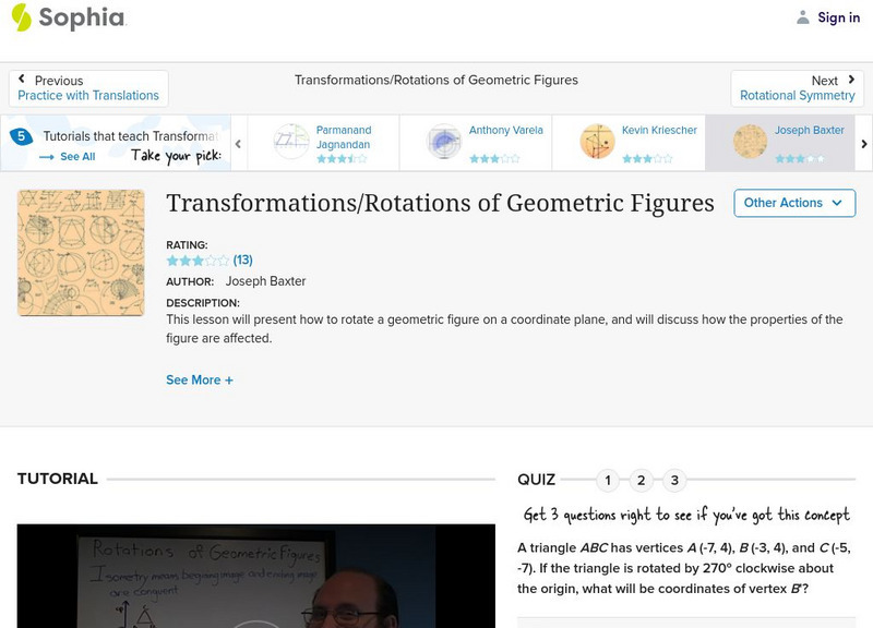 Pupils who view this tutorial will gain a better understanding of how to rotate a figure around the origin of a coordinate plane. This video covers how to rotate clockwise and counterclockwise to achieve the same purpose. Show this video...