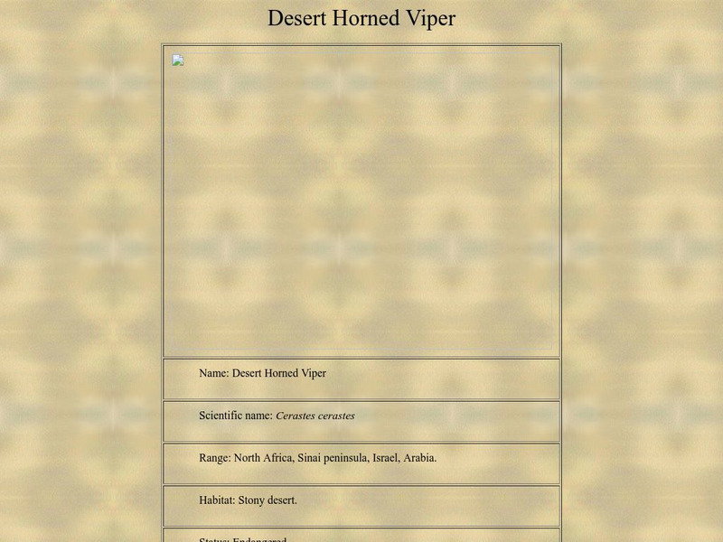 Special adaptations of the Desert Horned Viper are featured on the WHOZOO website. This endangered species lives in the sand and rocks of the deserts of North Africa, Israel, Arabia, and the Sinai peninsula.