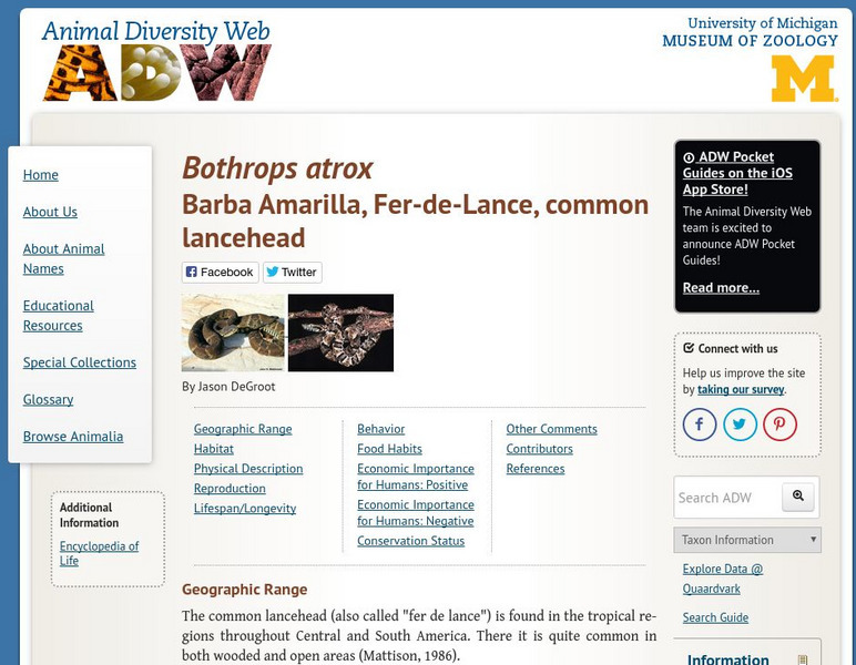 The University of Michigan Museum of Zoology presents information on the common lancehead. Pictures, classification, and additional facts are included.