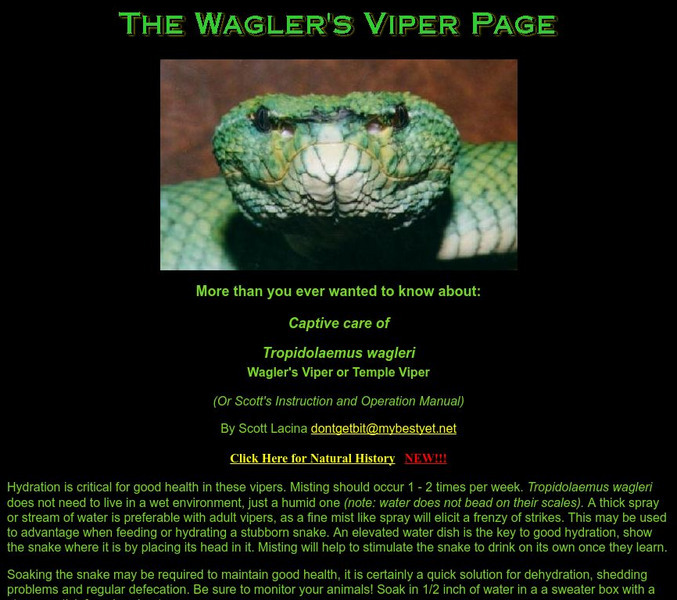 Great photos and tips for captive care of Wagler's Viper can be found on this personal website designed by Scott Lucina.