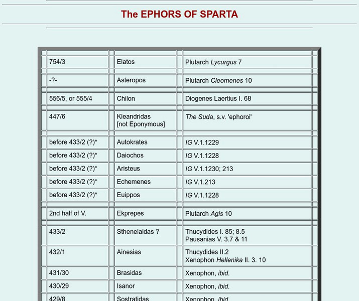 A list of citizens who served as Ephors in the government of ancient Sparta is provided in this chart. Contains the time they served as well.