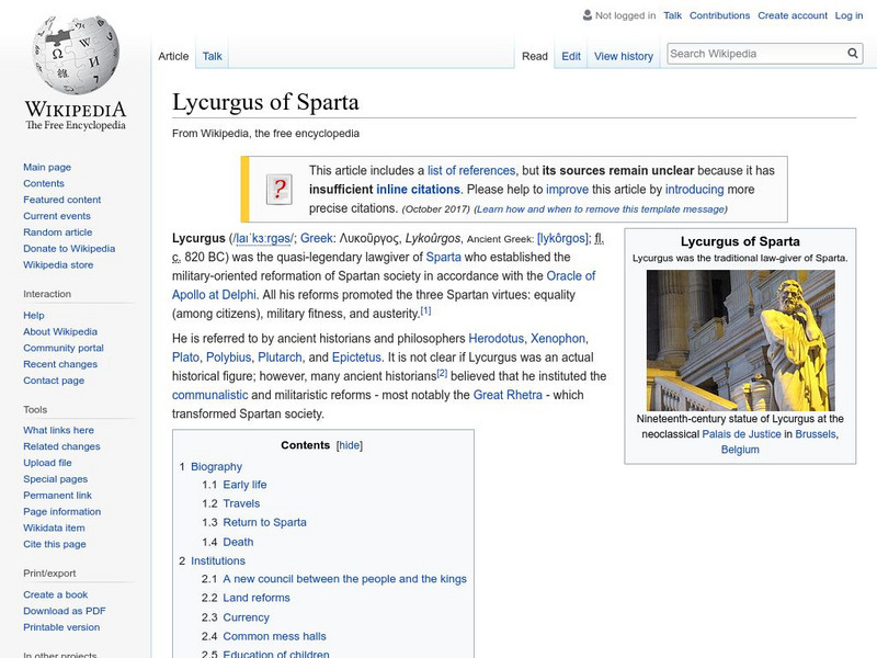 Encyclopedia article about Lycurgus of Sparta, who helped to establish Sparta's military-oriented society.