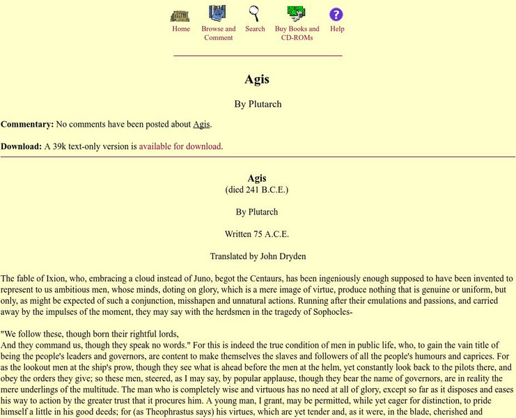 This site provides the full text of Plutarch's biography of Agis IV, Spartan king who tried to reform and restore the constitution of Sparta.