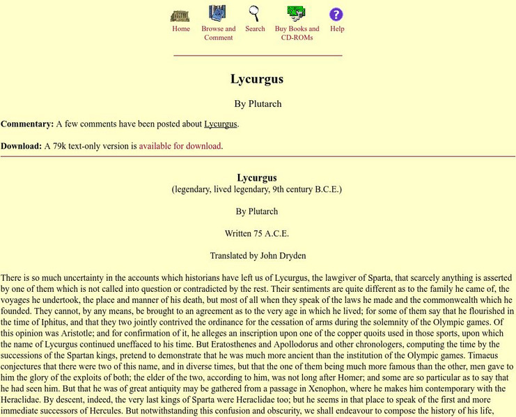 This site provides Plutarch's biography of Lycurgus, legendary founder of the Spartan constitution.