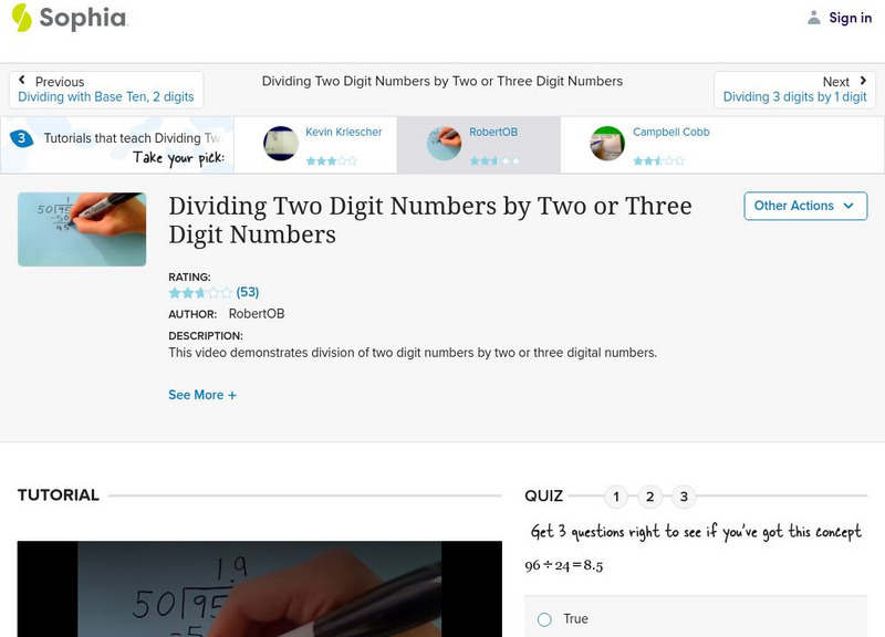 Sophia: Dividing Two Digit Numbers by Two or Three Digit Numbers: Lesson 4