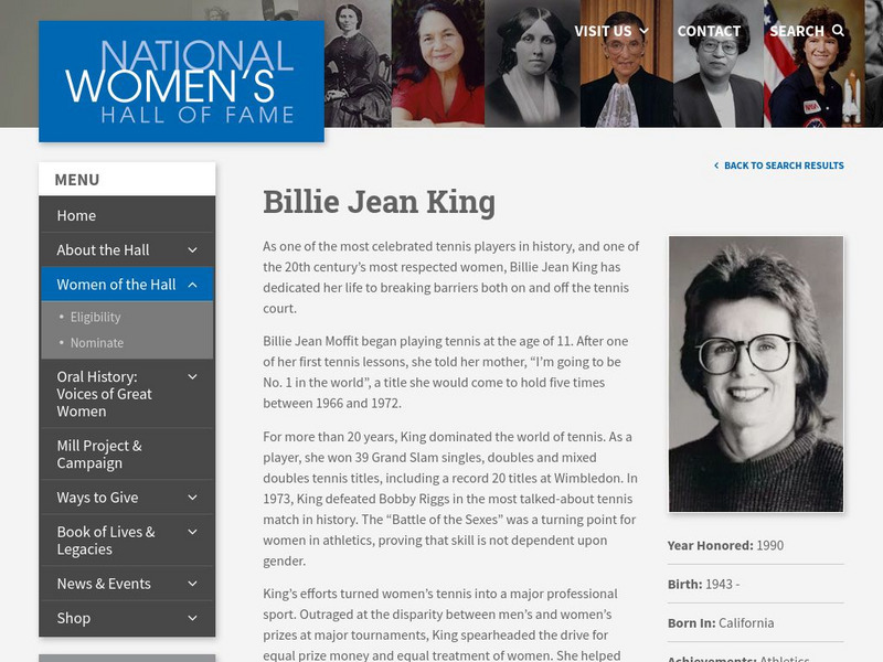 The National Women's Hall of Fame gives a tribute to Billy Jean King and her great accomplishments as a tennis player and as a pioneer for women in sports.