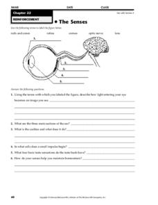 In this senses worksheet, learners use the terms listed on the eye to label the figure and describe how light entering the eye becomes an image seen. Then they name the three main sections of the ear and explain what the cochlea does.
