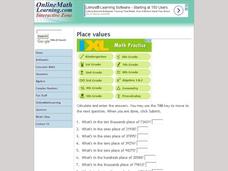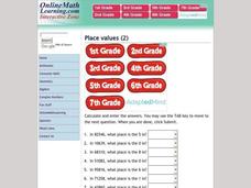 For this place value worksheet, students answer multiple choice questions about where a certain number is placed in the 5 digit number. Students complete 10 problems.