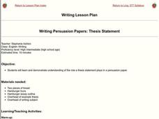 High schoolers explain the purpose of a thesis statement in an academic essay. They identify the two components of a basic thesis statement. Students identify, create and correct thesis statements.