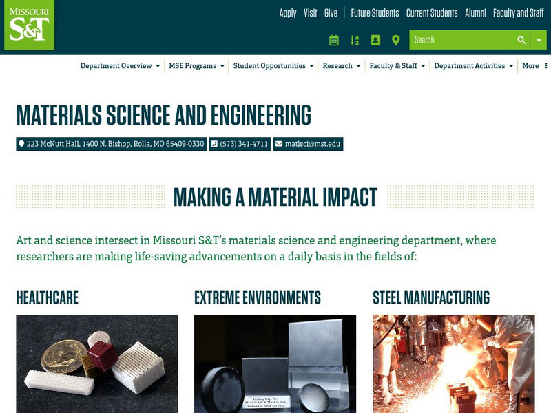 University of Missouri Rolla website devoted to the Department of Materials Science and Engineering. The site includes information on ceramics research, faculty, degrees, etc.