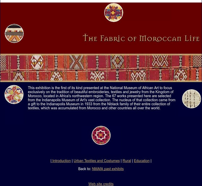 This online exhibit at the National Museum of African Art highlights textiles, embroidery, and jewelry from Morocco. Besides having pictures of 67 artifacts, there is a section on the history of Morocco. The education link allows...