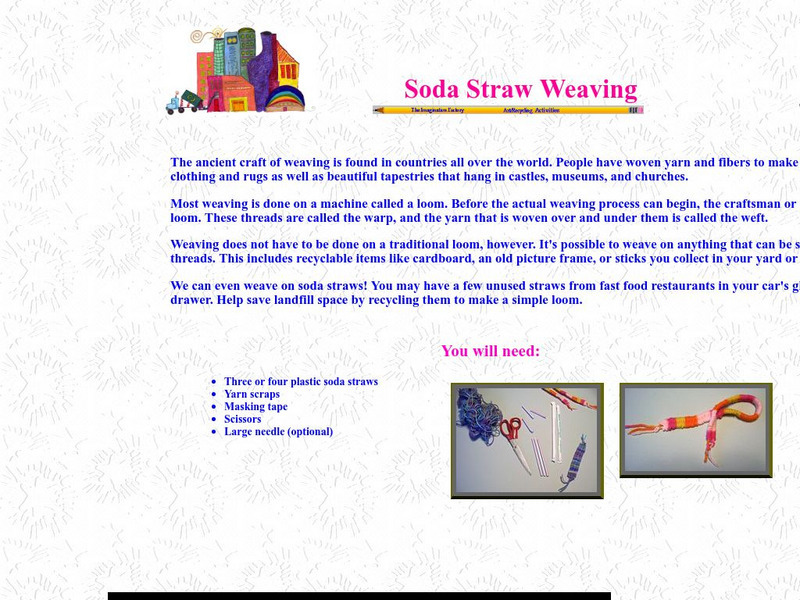 Using plastic straws and yarn, young children can weave a bracelet or bookmark. Website includes detailed instruction on how to weave using soda straws and images showing the various steps.