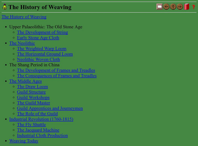 This site from the Alien Travel Guide contains an outline to information on the history of weaving. The outline is in link form for easy navigation and it contains wonderful basic information.