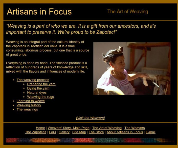 This site from Artisans in Focus contains wonderful information on the art of weaving. The site is outlined in link form for easy navigation and it contains information on subjects such as: preparing the yarn, dying the yarn, natural...