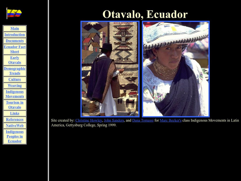 Fascinating and comprehensive look at the indigenous culture of Otavalo, Ecuador. Excellent photographs accompany this cultural treatise that examines the history, industry, and tourism of Otavalo. Additional links access more specific...