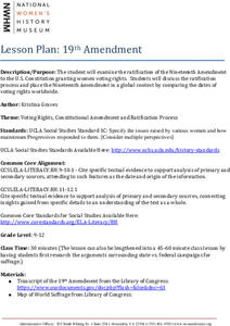 Votes for women! The activity highlights the push for the Nineteenth Amendment giving women the right to vote. High school scholars learn how the Fifteenth Amendment giving African American men the right to vote helped to spark the...