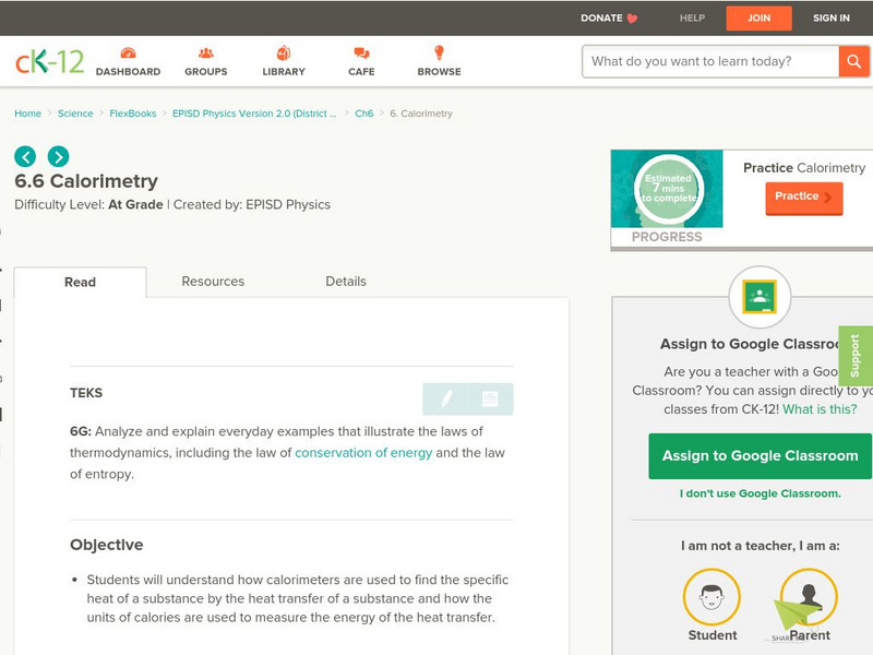 [Free Registration/Login may be required to access all resource tools.] Using diagrams and practice problems, students learn how the units of calories are used to measure the energy of the heat transfer. They also discover how...