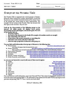 In this groups of the periodic table worksheet, high schoolers use on line sources to find characteristics of the alkali metals, the alkaline earth metals, the transition metals, the halogens and the inert gases.