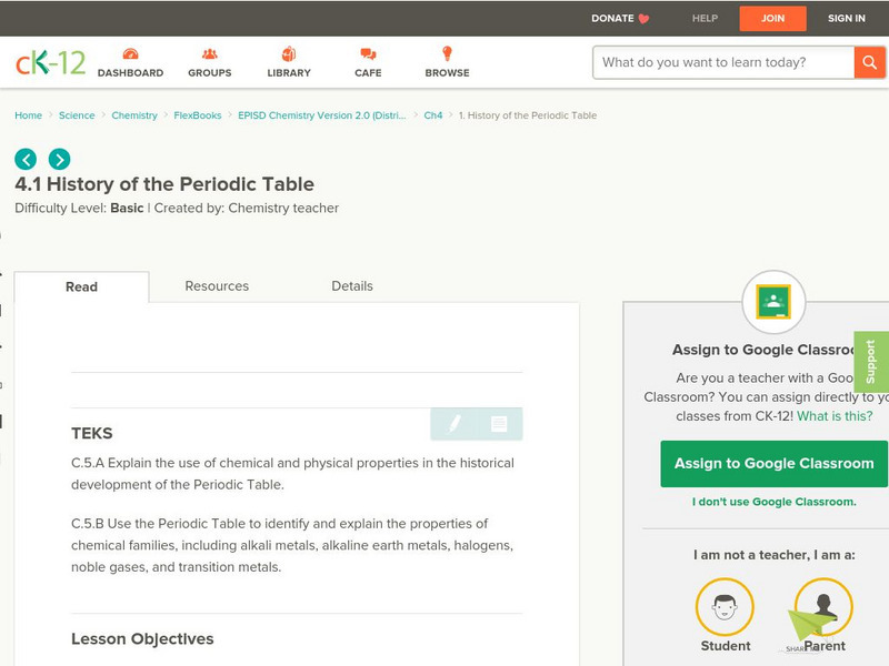 [Free Registration/Login may be required to access all resource tools.] In this online tutorial students will begin to explain the use of chemical and physical properties in the historical development of the Periodic Table. They will be...